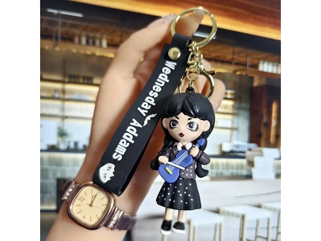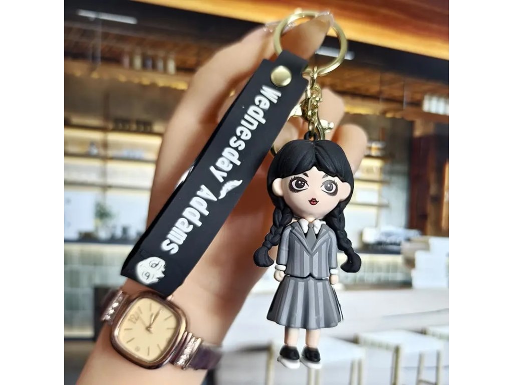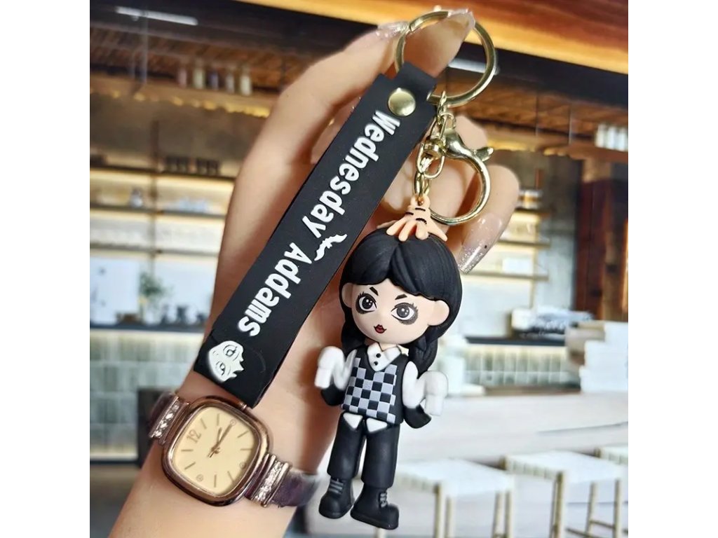 Na klíčenkách najdete samotnou Wednesday Addams v různých provedeních, které dokonale vystihují její osobitý styl a ikonický vzhled.